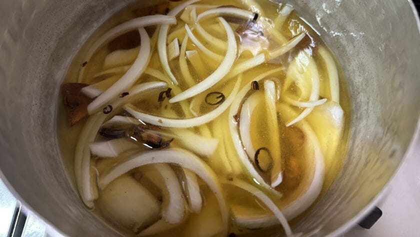 マリナードと同様にいっしょに漬ける野菜もこの段階でカットしておきます。玉ねぎはスライスしておきます。