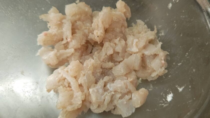 削ぎ落した身を1cm角ほどの角切りにしておきます。あとで合わせるミンチが繋ぎになるので、食感の違いを出すために少し大きくてもOKです。