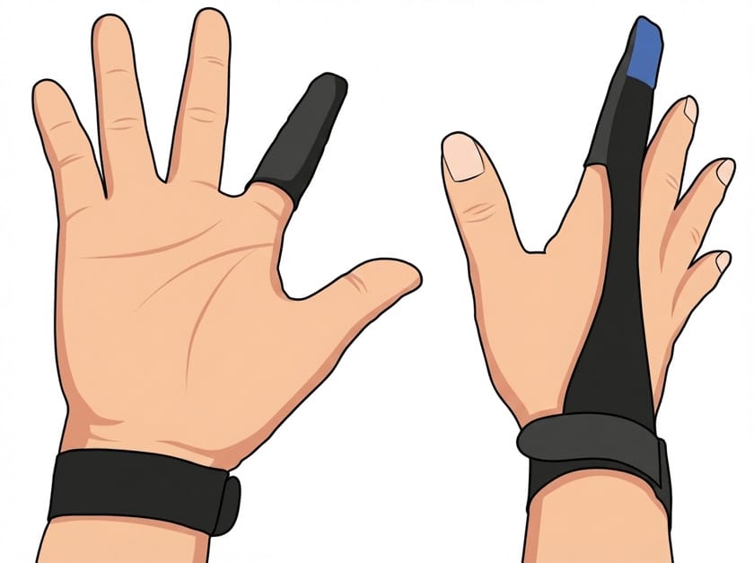 人差し指だけを保護すればいいので、人差し指1本だけを覆い手首で固定するものが一般的になっています。(指先だけのものもあります)